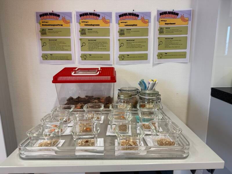 Gerne teile ich mein Material (Ausleihe) und meine Erfahrungen mit dir. Zum Mehlwurm-Projekt gehört das komplette Set: Kräftige Larven des Mehlkäfers inkl. Pflegeanleitung, Einstreu und Futter, 12 kleine Glasbehälter für die individuelle Beobachtung und Versorgung durch die Kinder (Zweiergruppen haben sich gut bewährt), eine Feinwaage, sowie ein kleines Kunststoffterrarium für die ausgewachsenen Käfer. Auch Bildmaterial, Informationen zum Lebenszyklus und Unterrichtsmaterial mit verschiedenen Aufträgen gehören dazu.