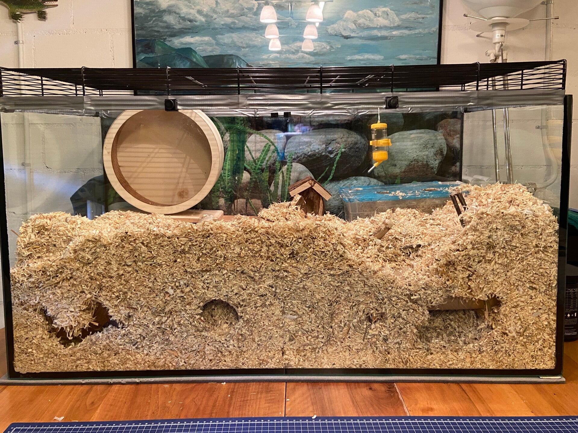 Hier oben im Vergesellschaftungs-Zimmer gibt es in allen Gehegen nur eine Einstreutiefe von 5-15 cm. Dies ist natürlich nicht geeignet zur dauerhaften Unterbringung, aber das brauche ich wohl keiner verantwortungsvollen Rennmaushalterin zu erklären. Generell sollte eine Einstreutiefe von mindestens 25 cm eingehalten werden, damit stabile Gänge gebuddelt werden können.